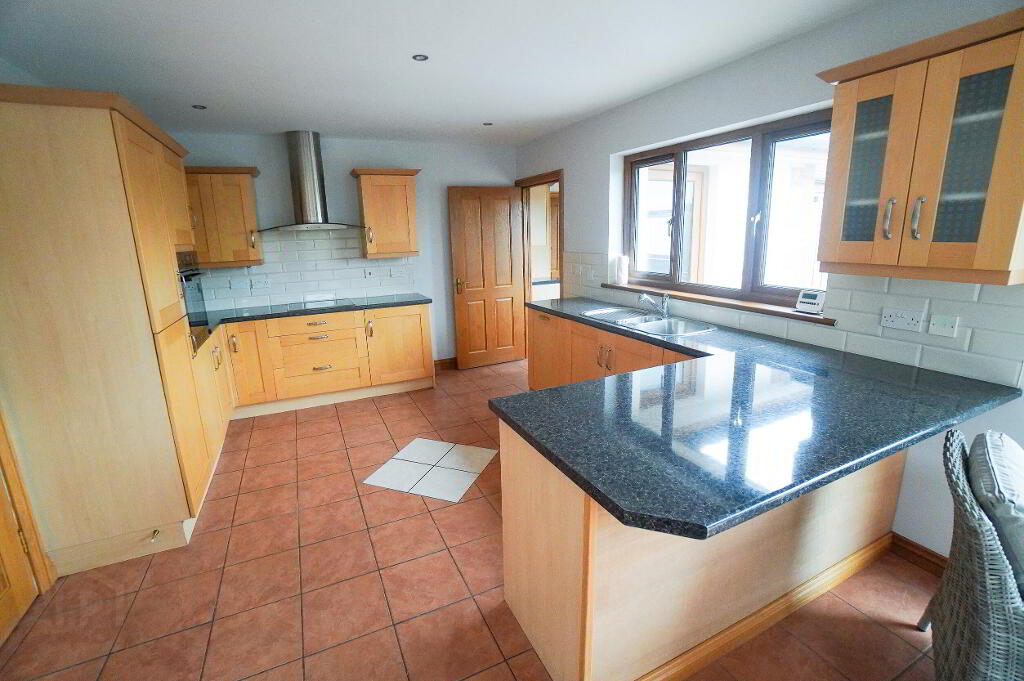 Tiled floor, recessed spotlights, Oak high and low level units with contrasting work surfaces. Fan oven, 4 ring ceramic hob with stainless steel extractor above. Integrated fridge freezer and dishwasher, 1 1/2 stainless steel sink unit & drainer. Sliding double doors to rear garden.