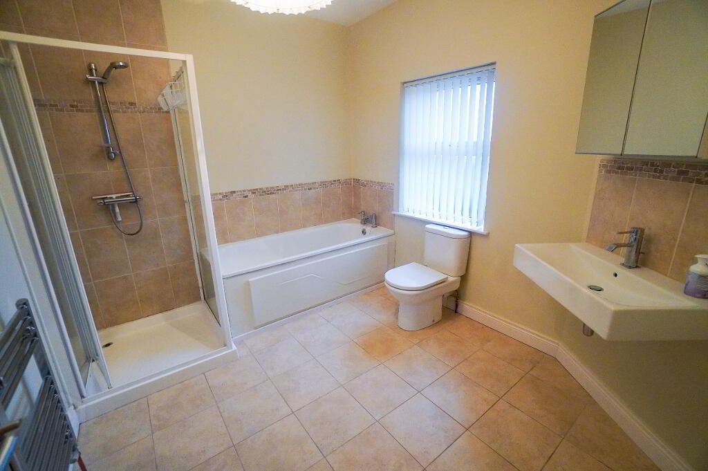 Tiled floor, part tiled walls. Low flush W.C, sink with vanity unit, thermostatic shower. Vertical chrome radiator, extractor fan.