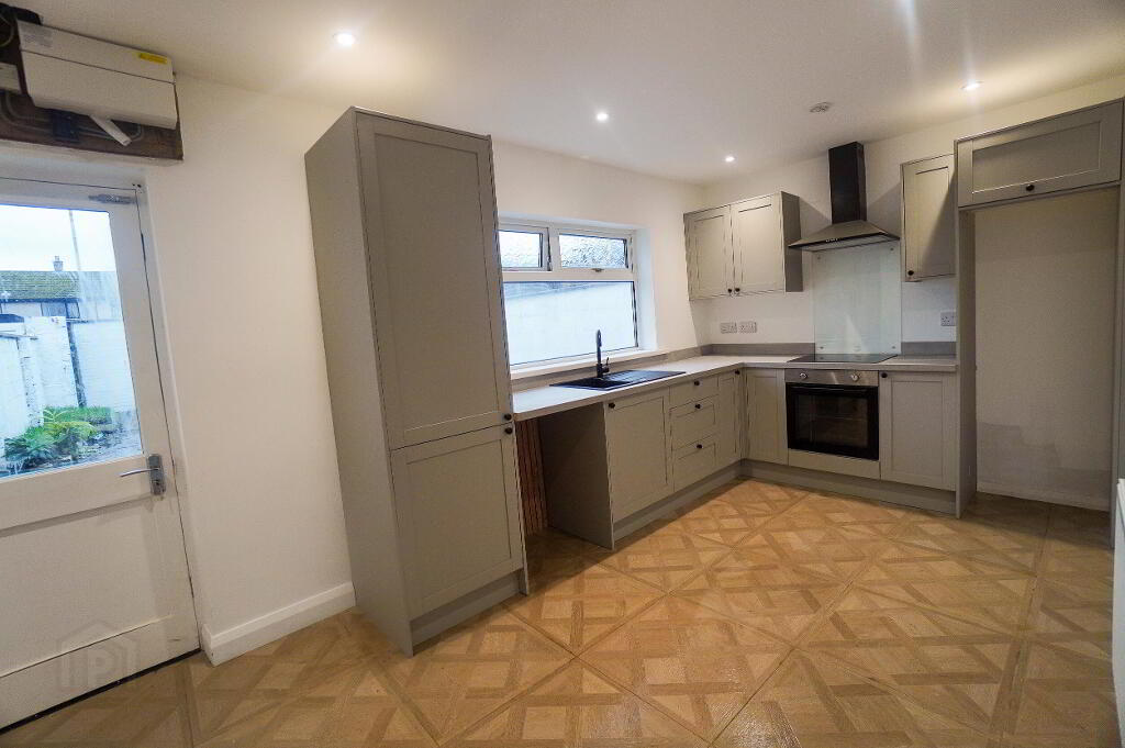 Tiled floor. Grey high & low level units with contrasting work surfaces & upstands. 4 ring hob with glass splash back, fan assisted oven, extractor hood, black composite sink unit with drainer. Door to rear garden.