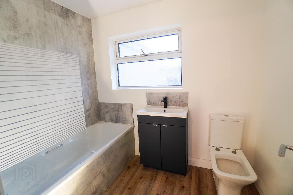 Laminate wood floor, PVC clad ceiling with recessed spot lights. Low flush W.C, sink with vanity under, panelled bath with thermostatic shower, black vertical heated towel rail.