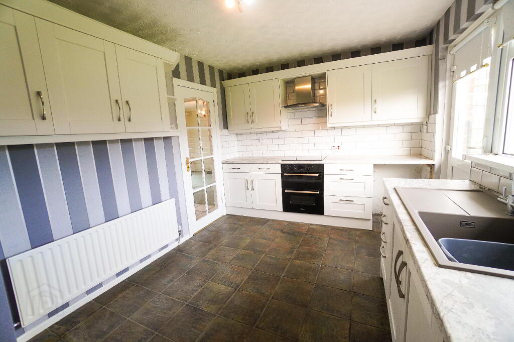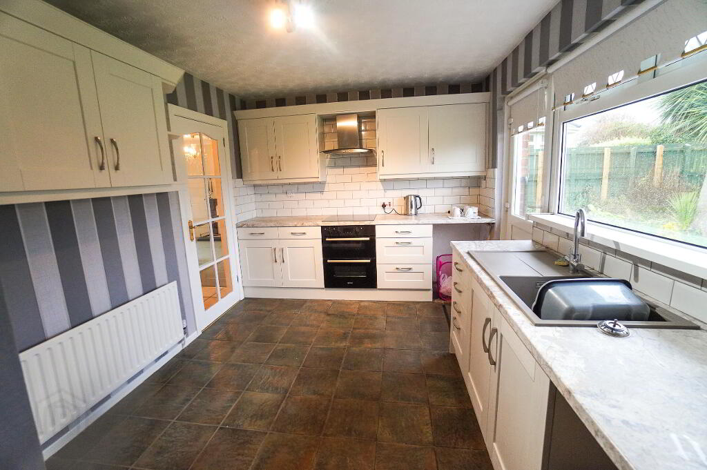 Tiled floor, part tiled walls. Grey 'Shaker' high & low level units with contrasting work surfaces. Ceramic Hob, double oven, plumbed for washing machine, glazed PVC door to rear garden.