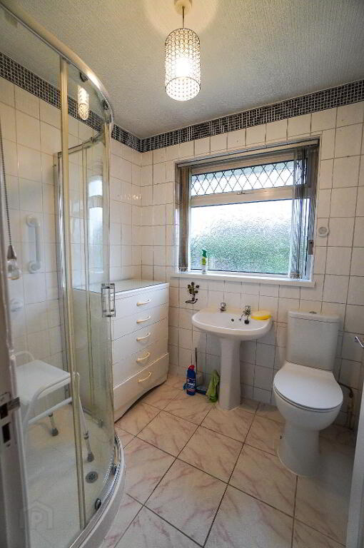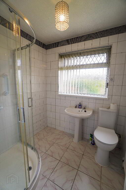Tiled floor & walls, low flush W.C, pedestal wash hand basin, corner electric shower.