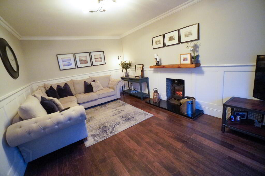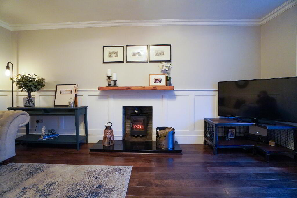 Laminate wood floor, wood panelling, fire place with multi-fuel stove and floating mantle, cornice.