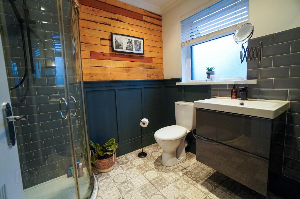 Recessed spot lights. Tiled floor, wood panelled walls, low flush W.C, wall mounted sink unit with under storage, corner shower.