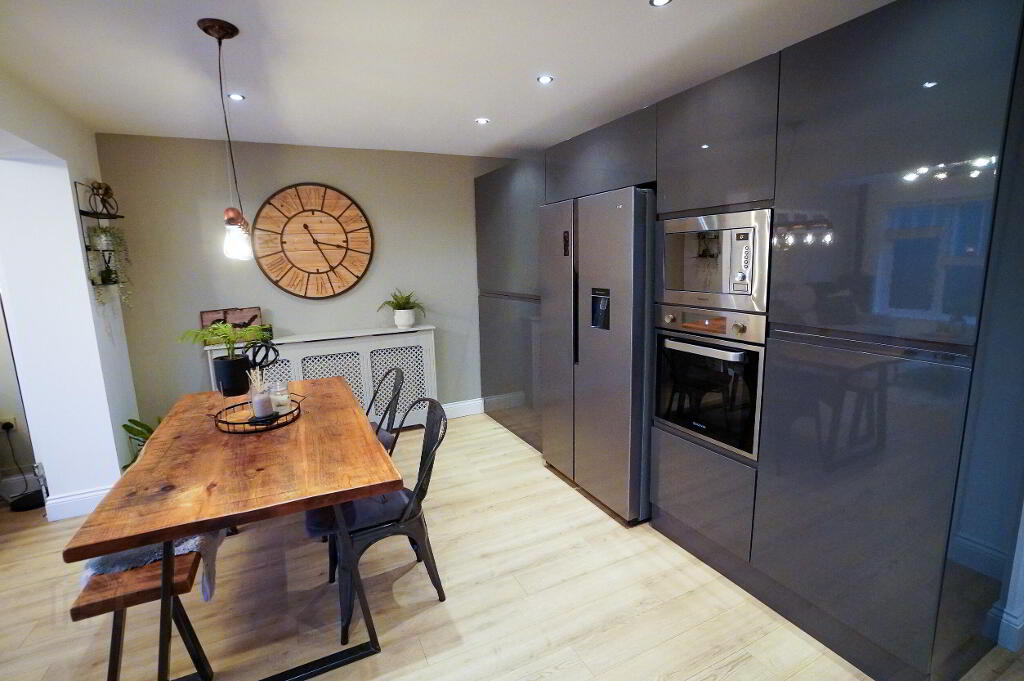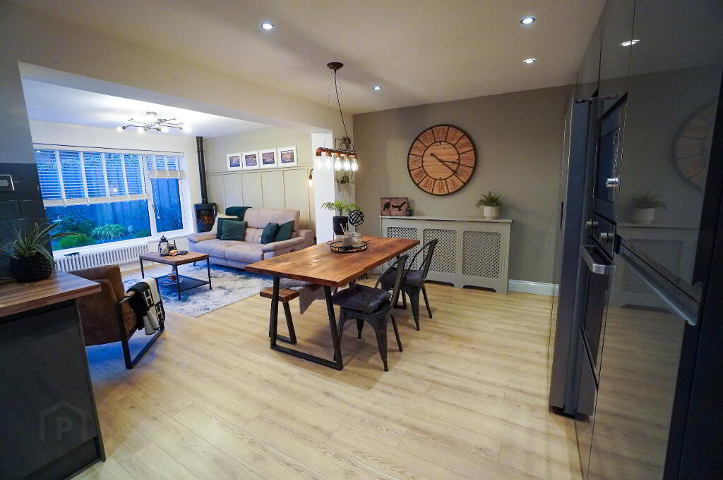 Modern extended Kitchen Living Dining to rear with integrated appliances and patio doors opening onto rear garden.