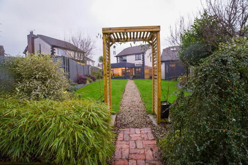 Fully enclosed landscaped rear garden, with lawn and patio area.