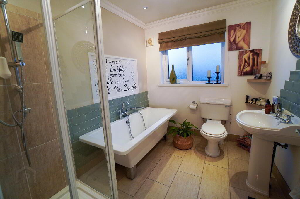 Recessed spot lights. Tiled floor, pedestal wash hand basin, W.C, double ended bath, separate shower enclosure, extractor fan.