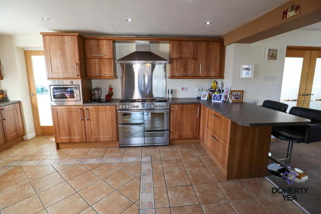 Tiled Floor, Recessed spotlight, Oak effect high & low level units with contrasting work surfaces and breakfast bar. 1 1/2 stainless steel sink unit with drainer. Stove range with 7 ring gas hob, stainless steel splash back and extractor fan. Integrated microwave, fridge freezer and dishwasher. Integrated food processor / mixer. Open into;