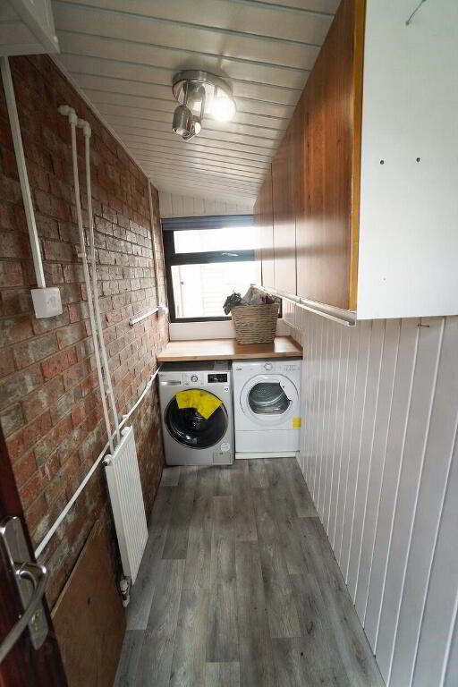 Laminate wood floor, hot press, roof space access.