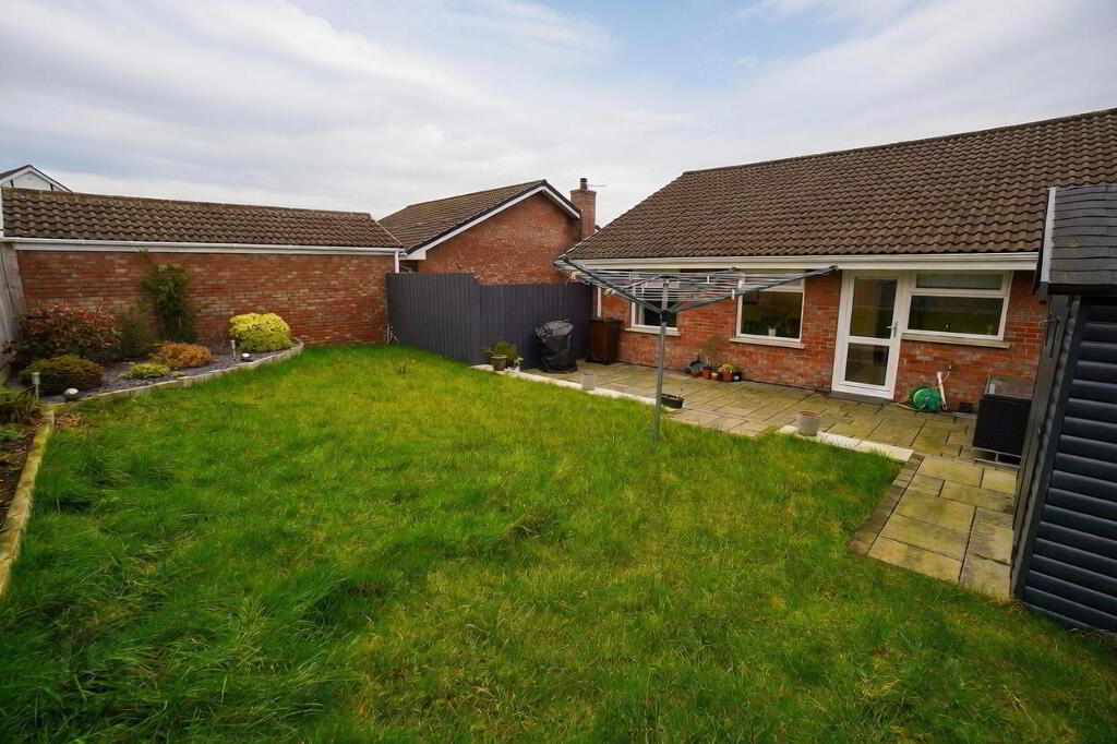 Enclosed rear garden with patio area and lawn.