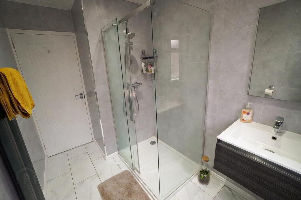 Tiled floor, pvc panelled walls and ceiling. Recessed spot lights, extractor fan. Low flush W.C, wall mounted sink unit with vanity under, walk in shower, vertical radiator.