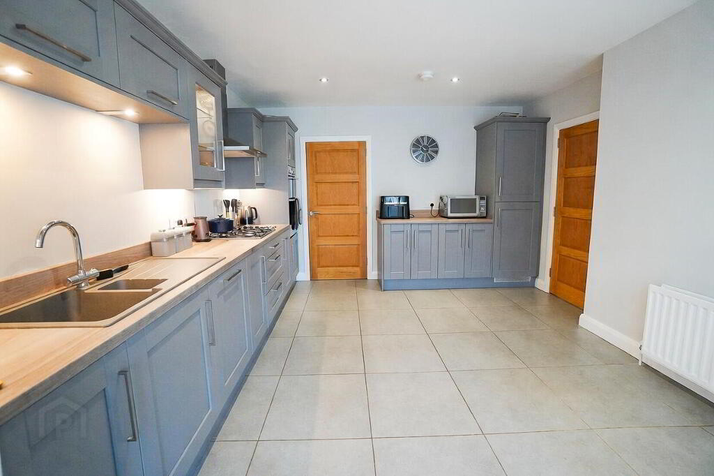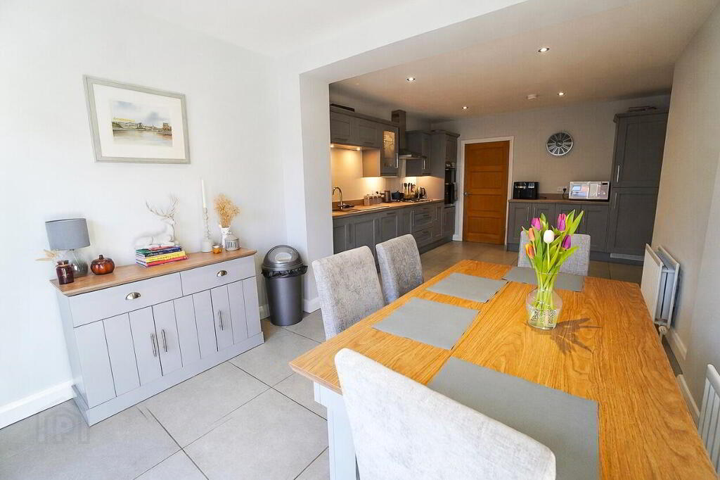 Tiled floor, recessed spotlights. Grey shaker style high & low level units with contrasting work surfaces. 4 ring gas hob with extractor fan above, double oven, integrated dishwasher and fridge freezer. Composite 1 1/2 bowl sink unit with mixer tap. Under stairs store. PVC double doors to rear garden.