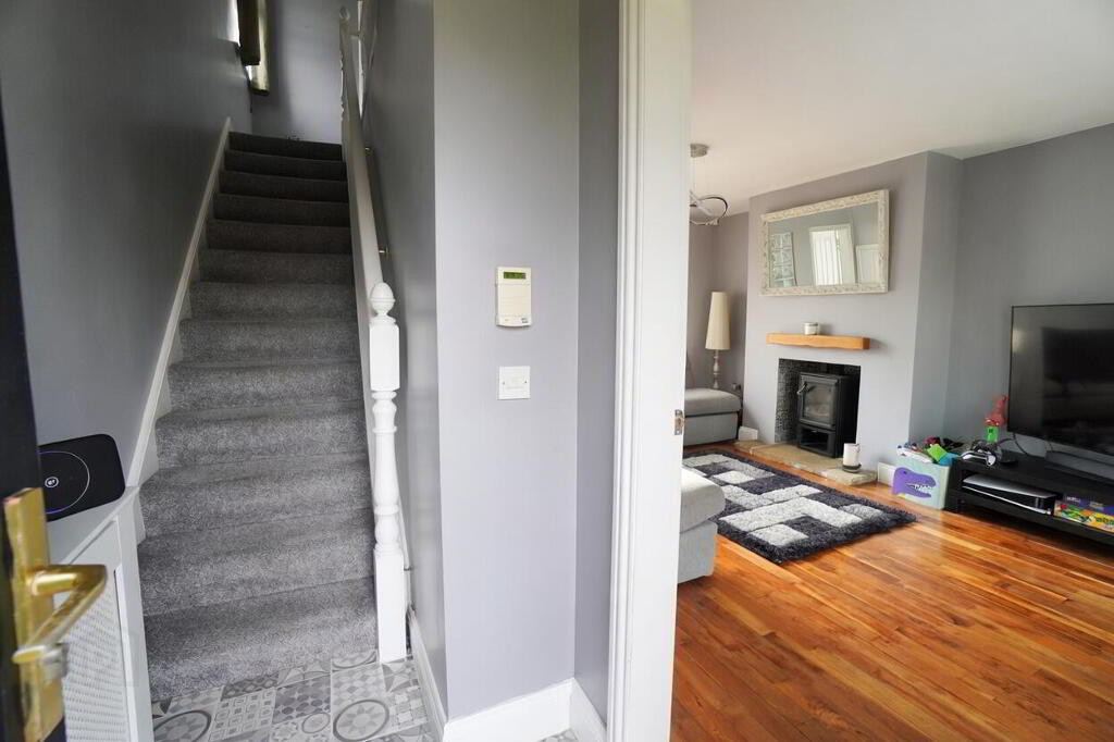 Multi fuel stove, with wood mantel and stone hearth. Solid wood flooring. Under stairs storage.