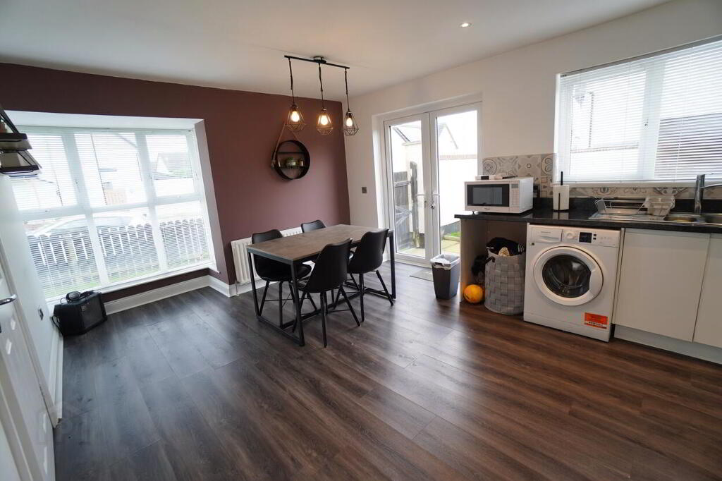 Spacious Kitchen / Diner with white high & low level units and patio doors to rear garden.