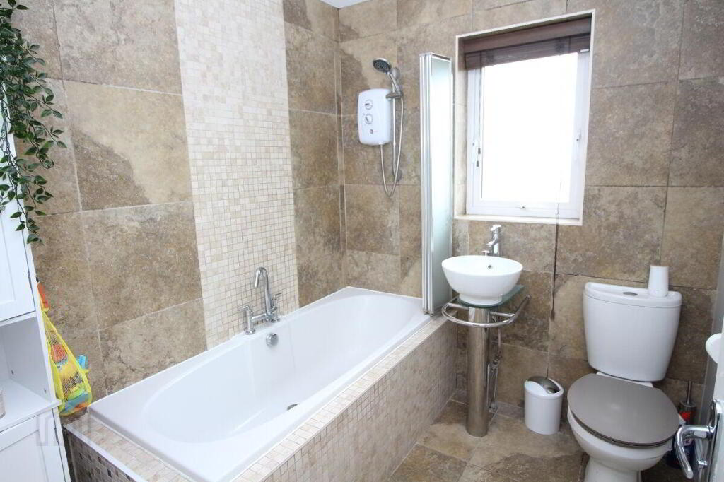 White suite comprising tiled panelled bath with Triton electric shower over, wash hand basin and low flush wc. Part tiled walls. Ceramic tiled floor. Ceiling spot lights. Extractor fan.