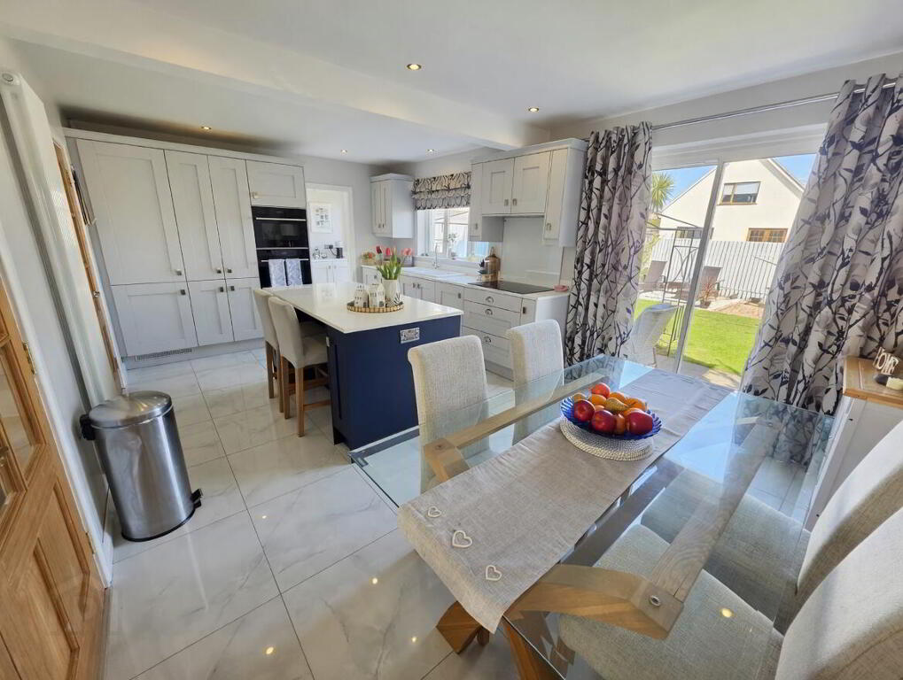 Recessed spotlights, ceramic tiled floor. Shaker style high & low level units with contrasting work surfaces and matching island unit with breakfast bar. 4 ring ceramic hob with integrated extractor above, Double oven / combination oven - microwave, integrated fridge freezer, integrated dishwasher, ceramic sink with drainer. Sliding patio doors to rear garden. vertical radiator. Double doors to Lounge.